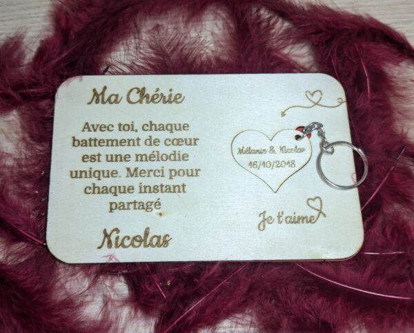Cette année, surprenez votre moitié avec une carte en bois personnalisée, accompagnée d’un porte-clé amovible.
