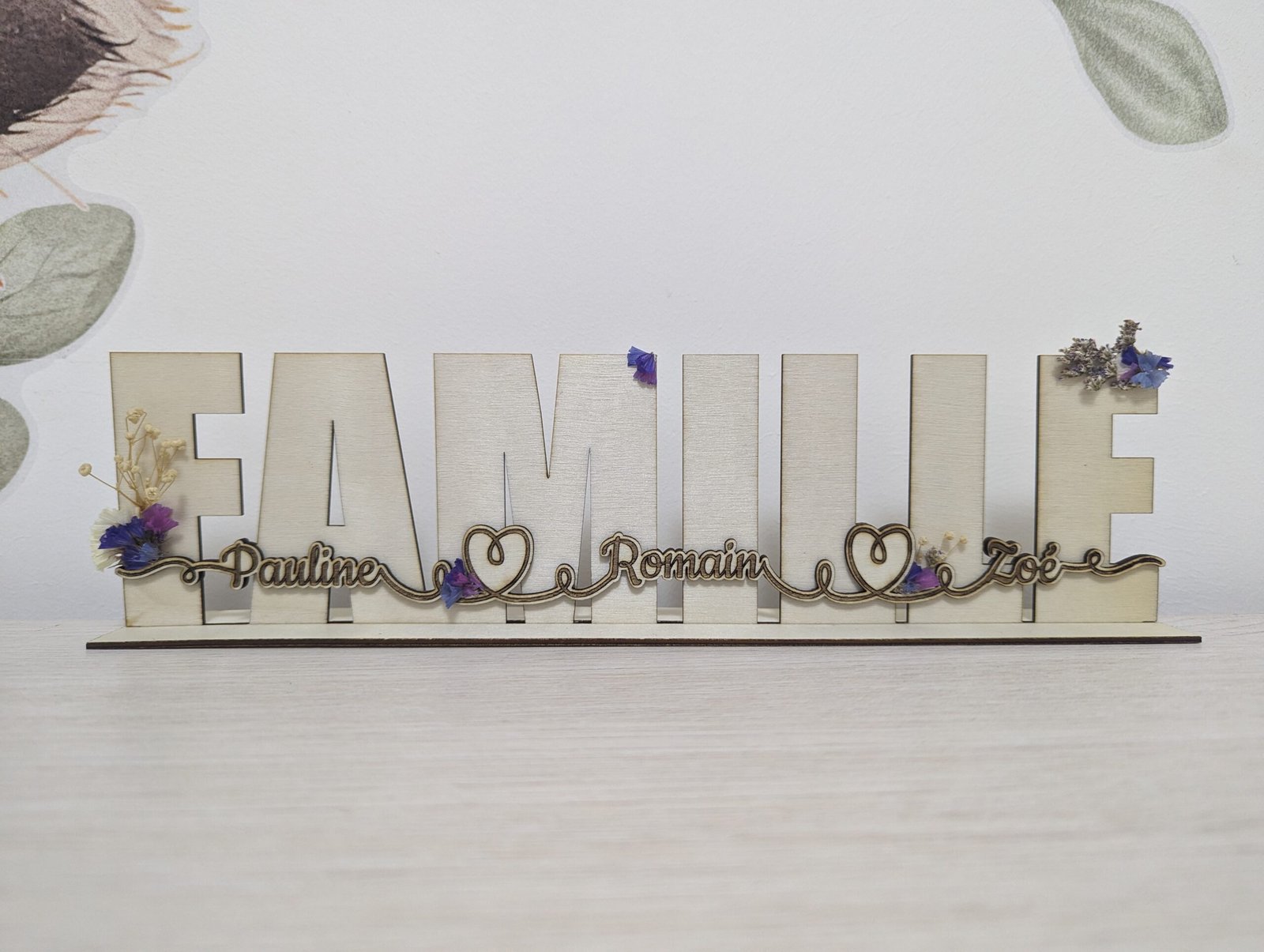 La décoration en bois peut accueillir jusqu’à 6 prénoms par ligne, au-delà de 6 prénoms, il y aura une deuxième ligne.